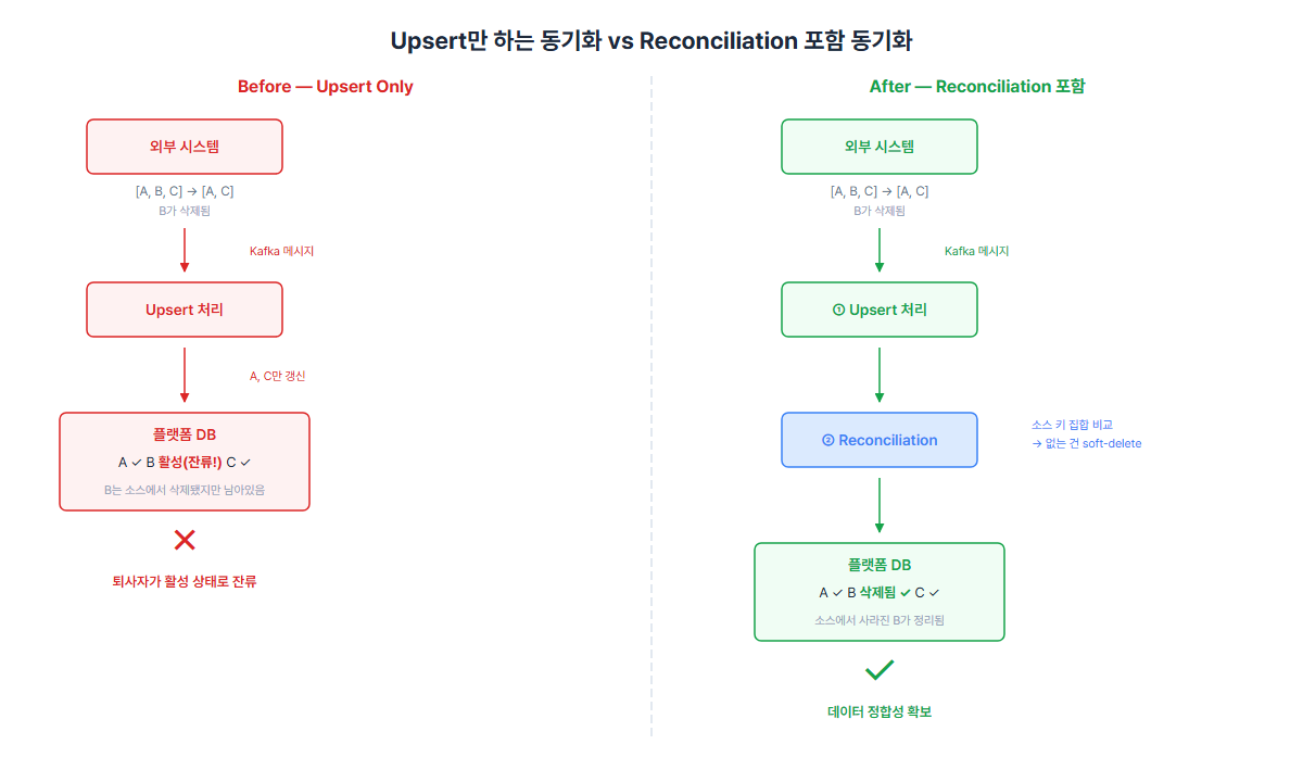 외부 시스템: [A, C] → 동기화 → 플랫폼: [A, B, C] ← B가 안 지워짐!