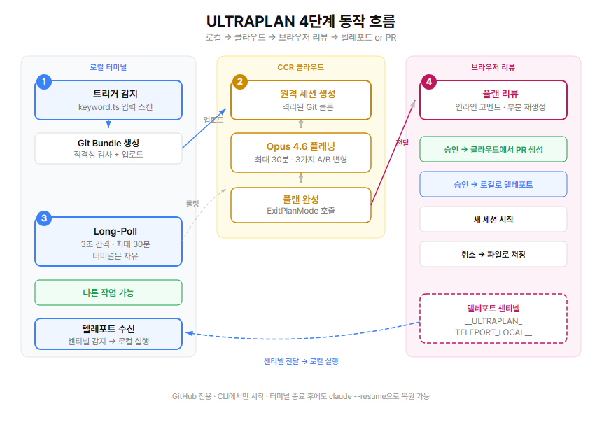 ULTRAPLAN은 트리거 감지 → 원격 세션 → 폴링 → 결과 전달의 4단계로 동작한다.